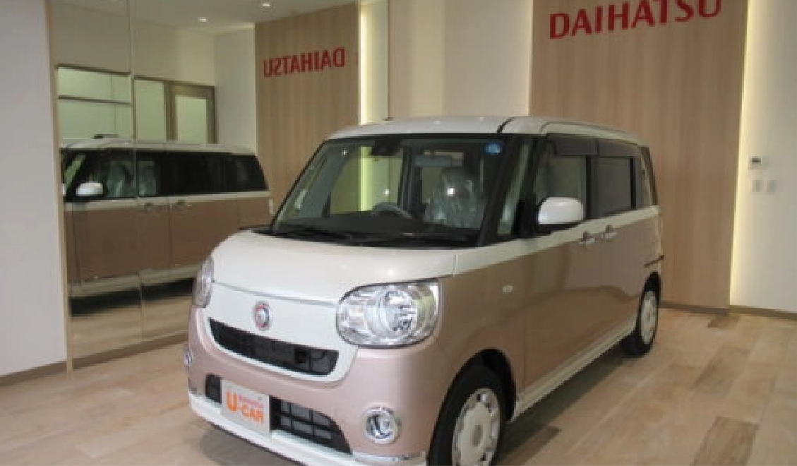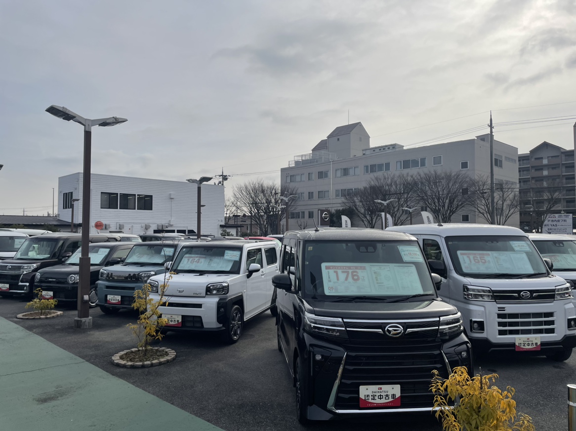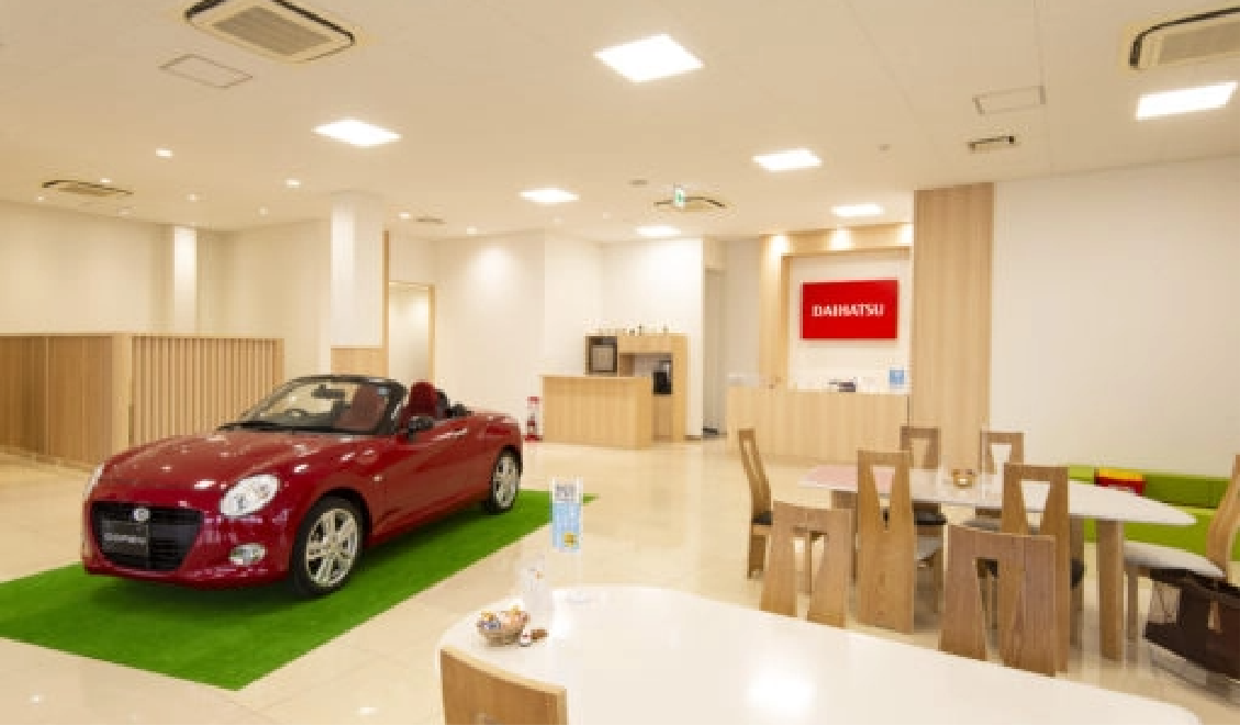 明るい展示場には常時約6 0台のダイハツ認定中古車を展示をしており、
